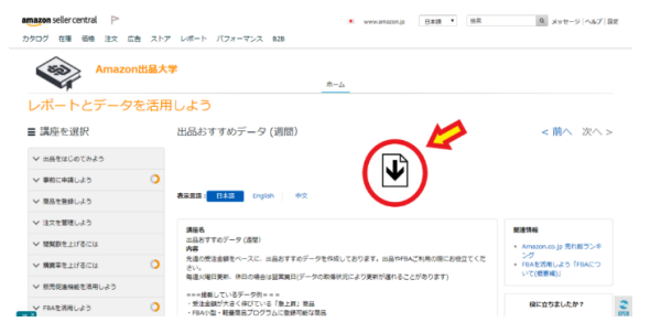 Amazon 出品大学のトップページ左側の一覧下部 [レポートとデータを活用しよう]をクリックします。